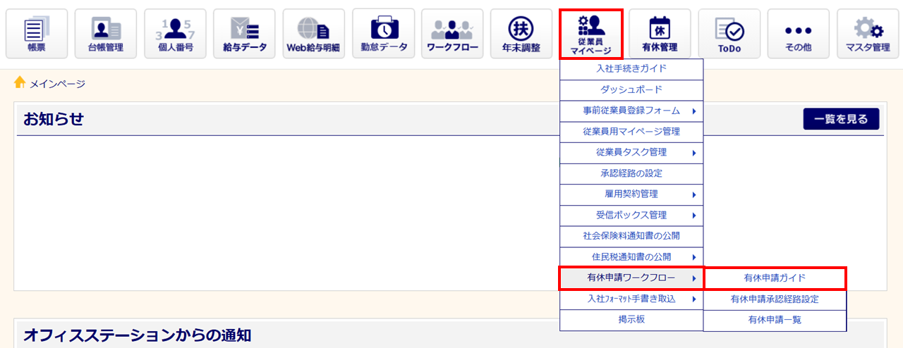 管理者権限ではない利用者の場合、[有休申請ガイド]および[有休申請承認経路設定]は表示されません。