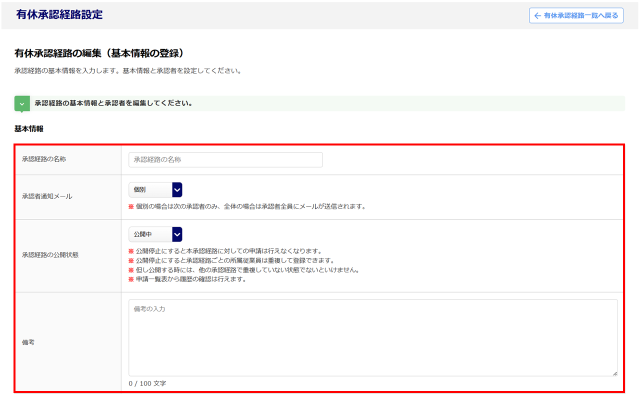 | 承認経路の名称 | 任意の承認経路の名称を設定します。20文字以下で任意の名称を設定してください。 |