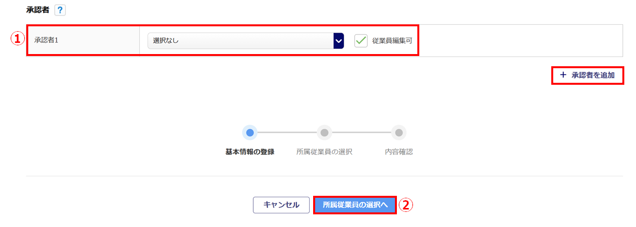 「承認者1」(①)を選択し、[所属従業員の選択へ](②)をクリックします。