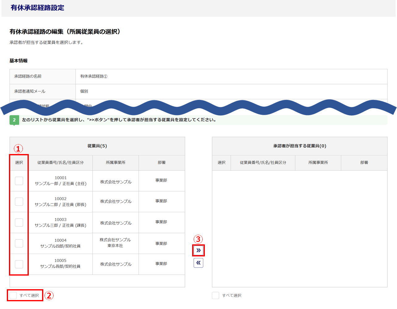 左のリストから本承認経路を割り当てる従業員の「選択」列(①)にチェック、または、すべての従業員を割り当てる場合は「すべて選択」(②)にチェックし、[≫](③)をクリックします。