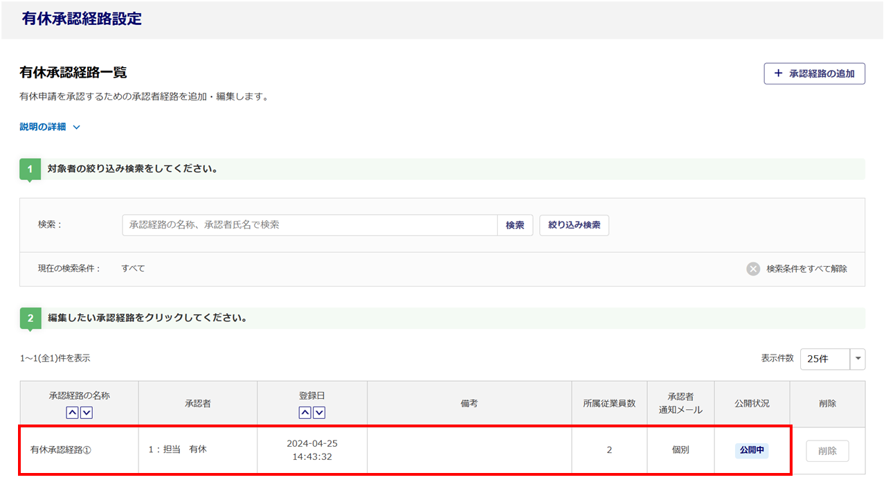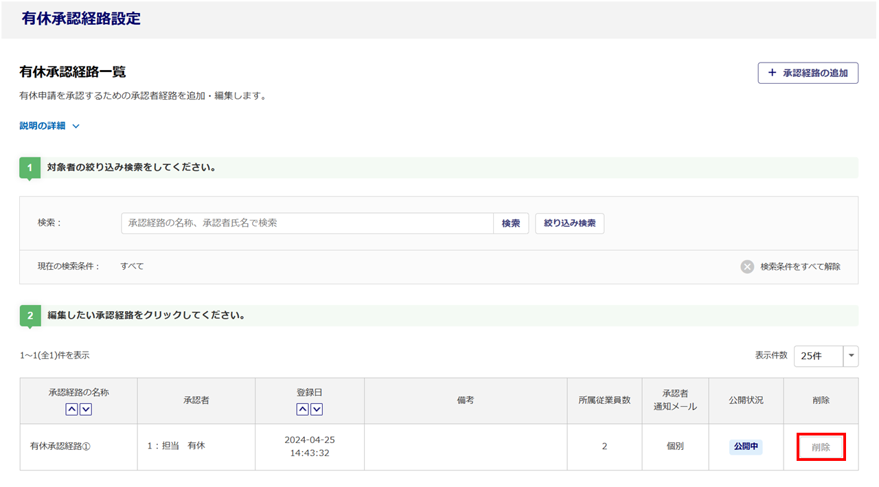 登録済みの有休申請承認経路の削除をおこなう場合は、[削除]をクリックします。