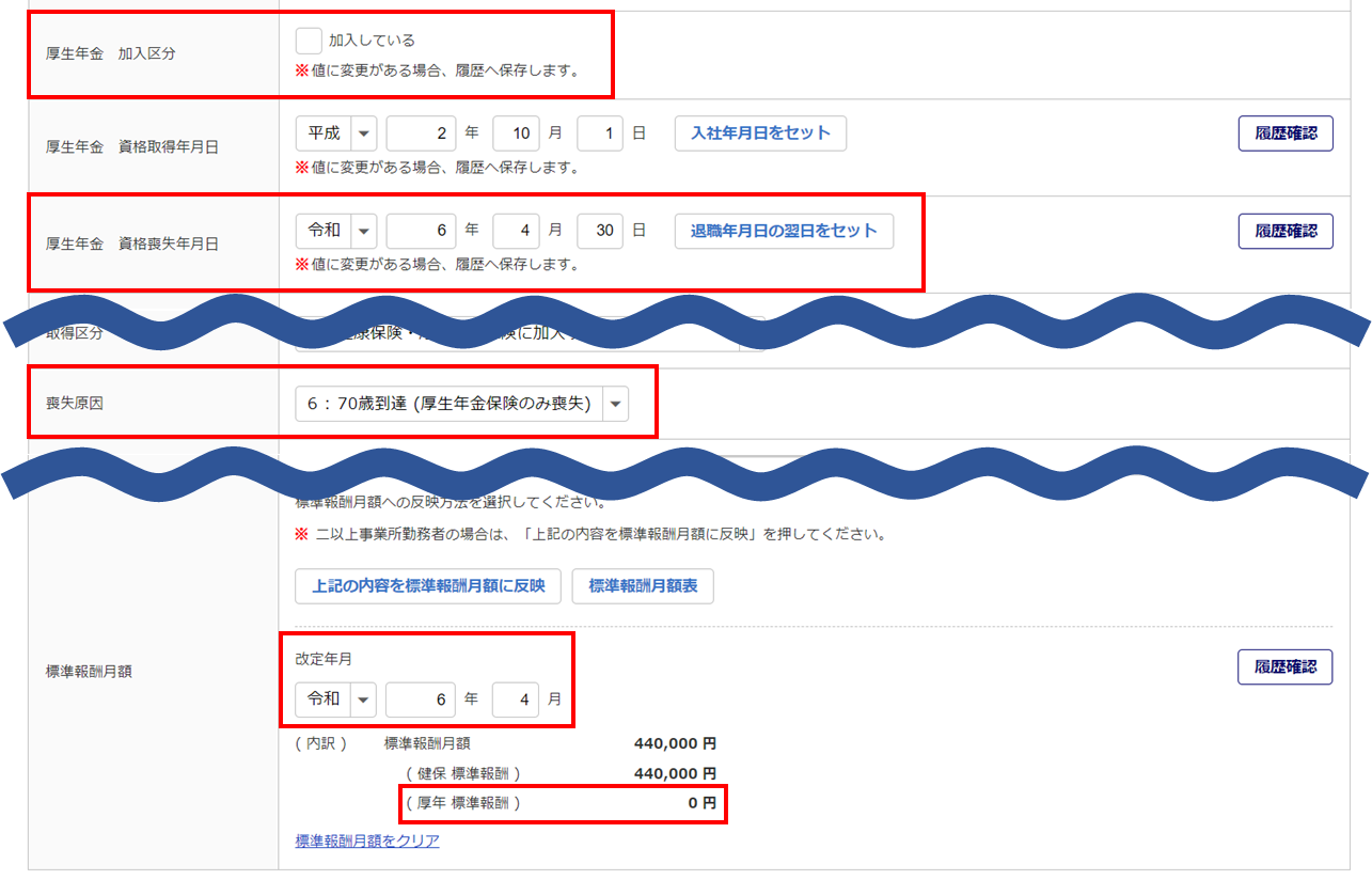 「標準報酬月額:改定年月」が「資格喪失年月日」の年月の場合、当該年月まで社会保険に加入していたと判断するため、正しい情報で出力されません。 |