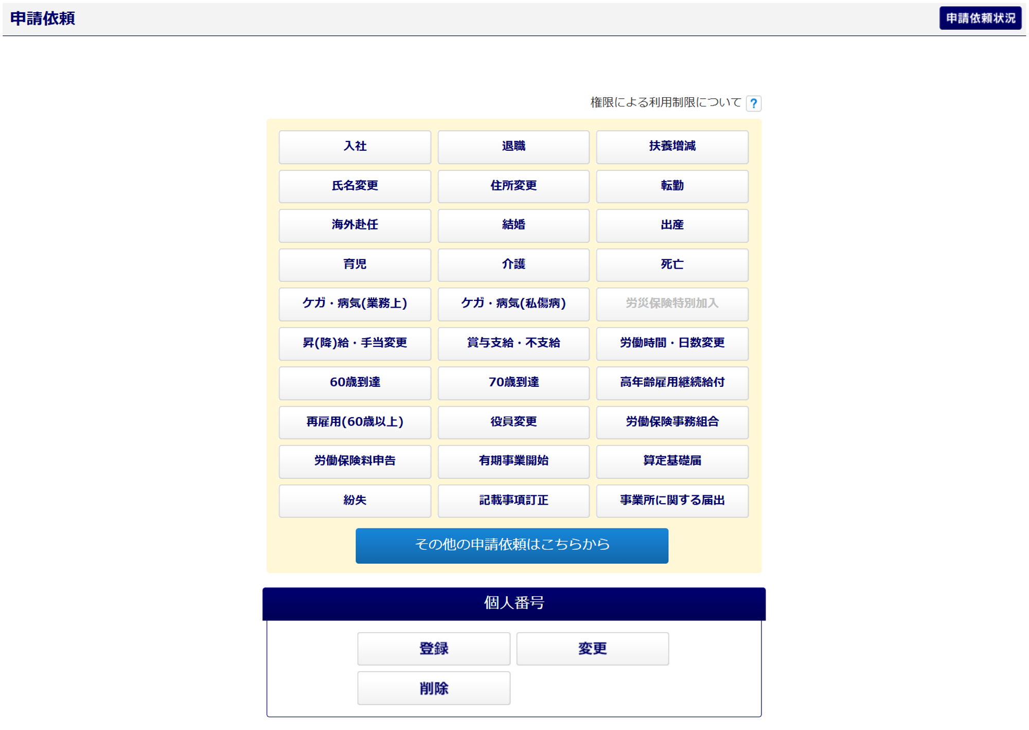 「申請依頼」画面に表示されている「入社」「退職」などのメニューに対して、対象手続きとして表示される手続きをご紹介します。