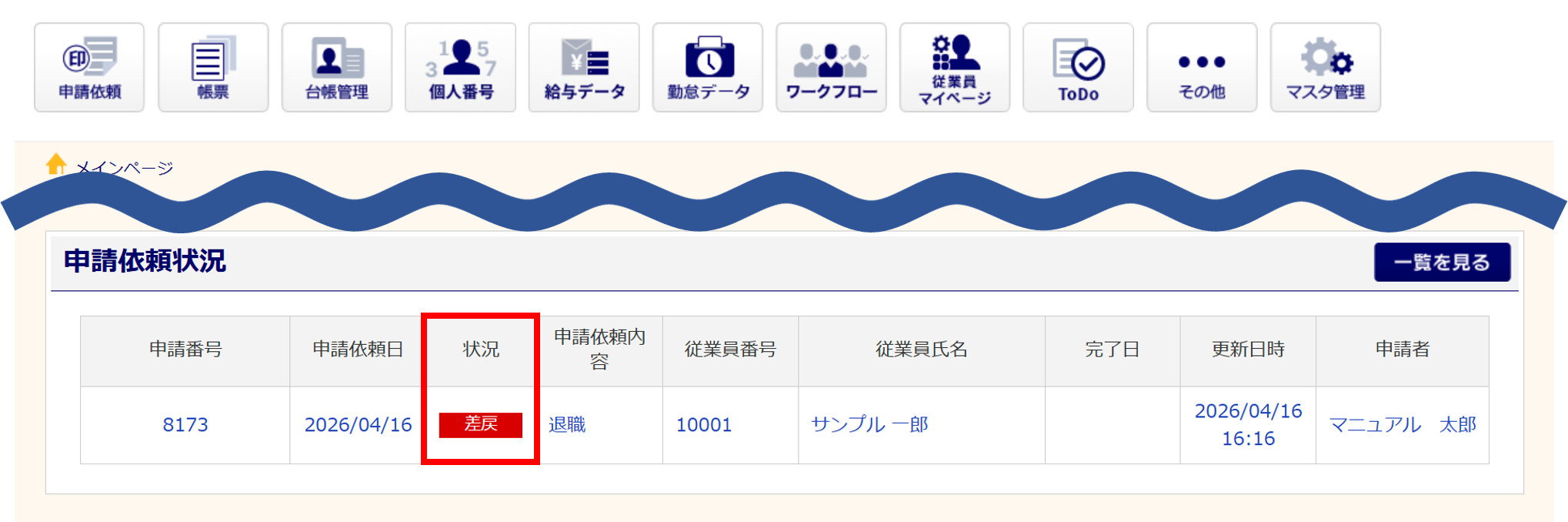 「申請依頼状況」欄の「状況」列に「差戻」と表示されます。