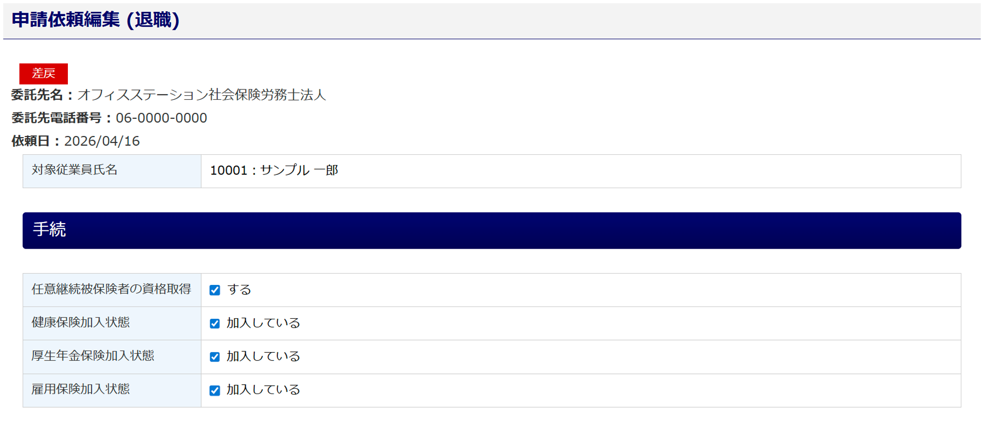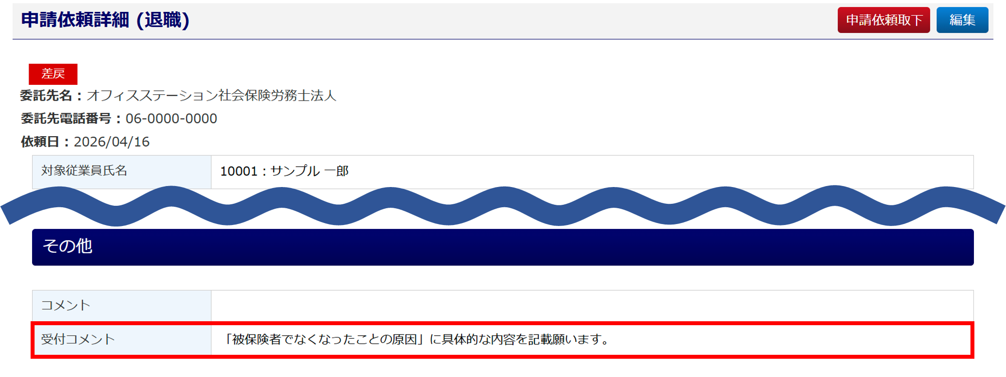 「申請依頼詳細」画面の「その他」カテゴリ内「受付コメント」に、委託先社労士からのコメントが設定されている場合がありますので、ご確認ください。