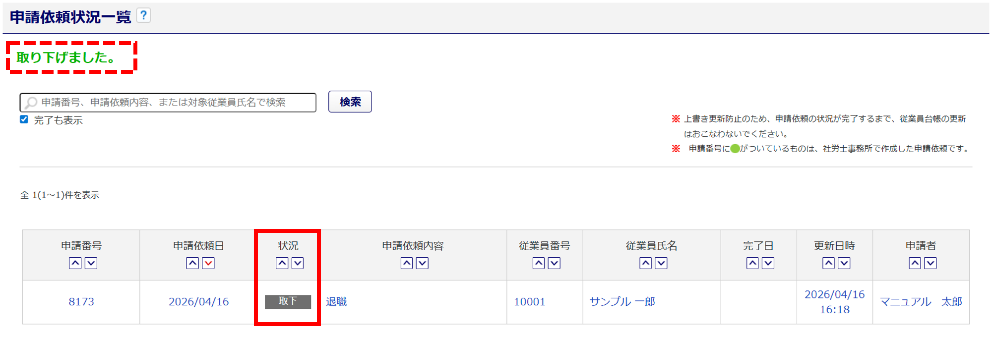画面上部に「取り下げました。」と表示され、一覧の「状況」列が「取下」へ更新されます。