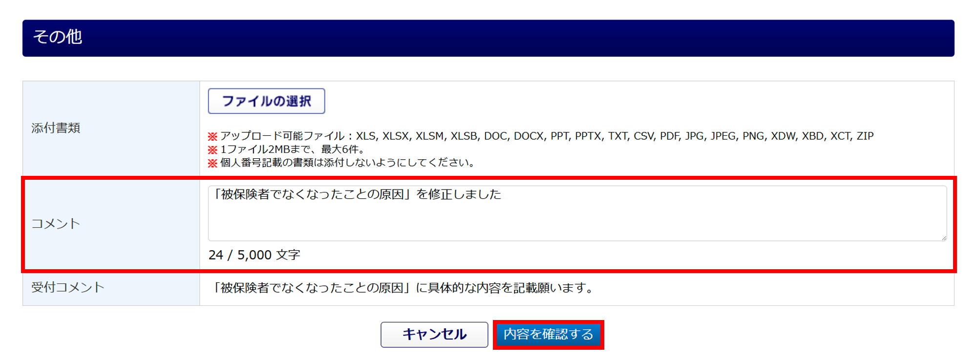 委託先社労士に伝えたいこと等がある場合、「コメント」に入力します。