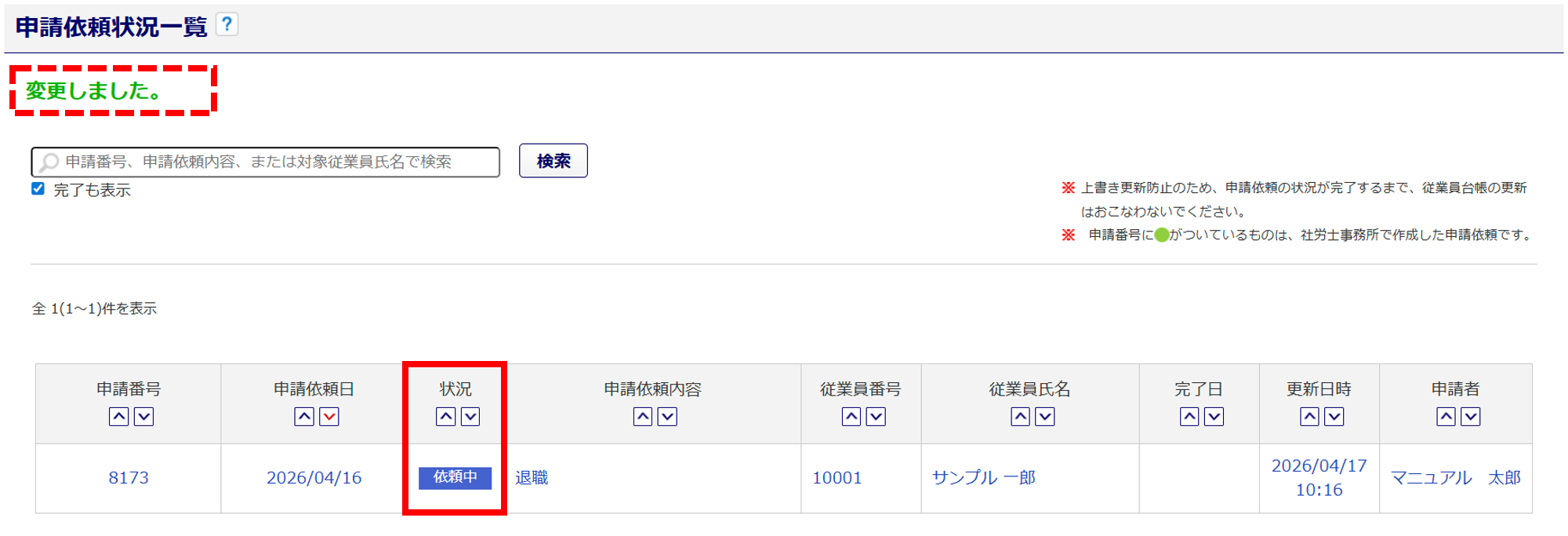 画面上部に「変更しました。」と表示され、一覧の「状況」列が「依頼中」へ更新されます。