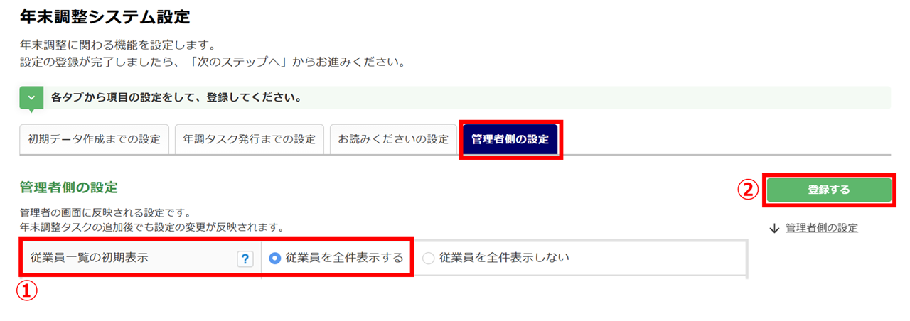 「年末調整システム設定」の「管理者側の設定」タブにて、「従業員一覧の初期表示」(①)を「従業員を全件表示する」に変更し、[登録する](②)>[登録]をクリックします。