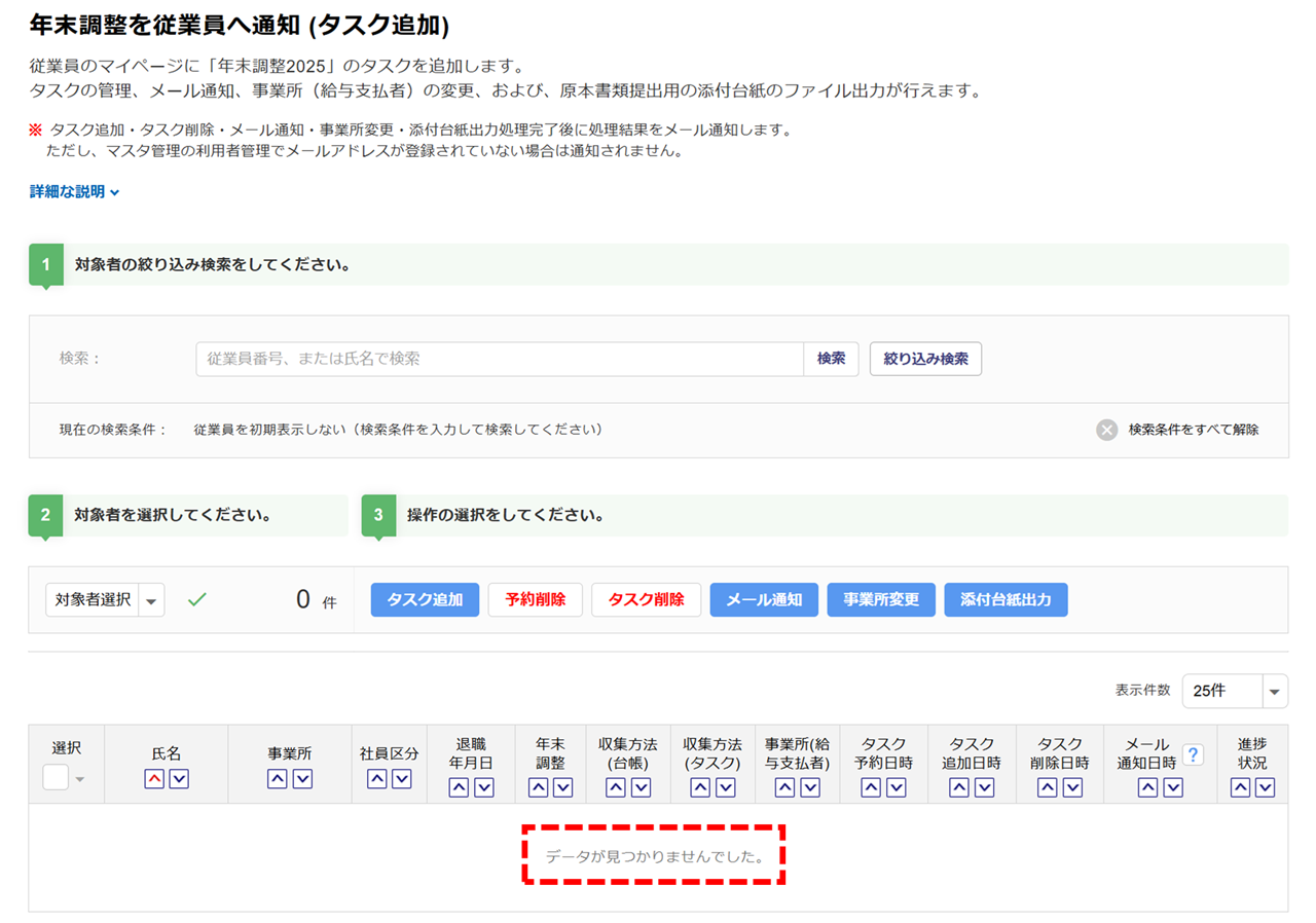 (「年末調整2025 年末調整を従業員へ通知(タスク追加)」画面)