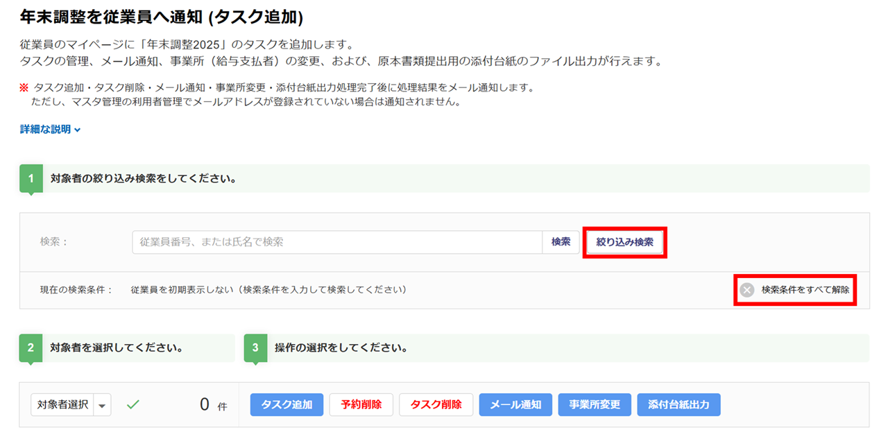 「年末調整を従業員へ通知(タスク追加)」画面にて、[絞り込み検索]をクリックし、条件を設定して従業員を検索することで従業員が表示されます。
