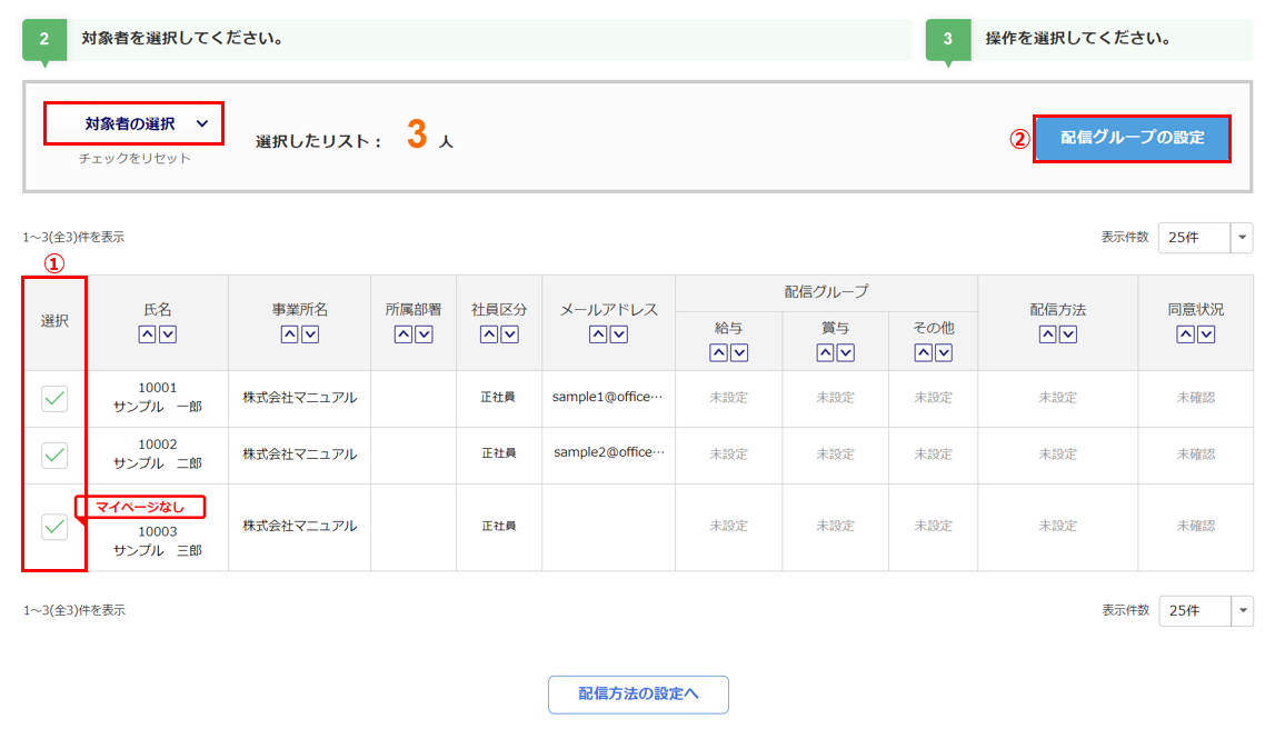 配信グループを設定する従業員の「選択」列(①)にチェックをつけ、[配信グループの設定](②)をクリックします。
