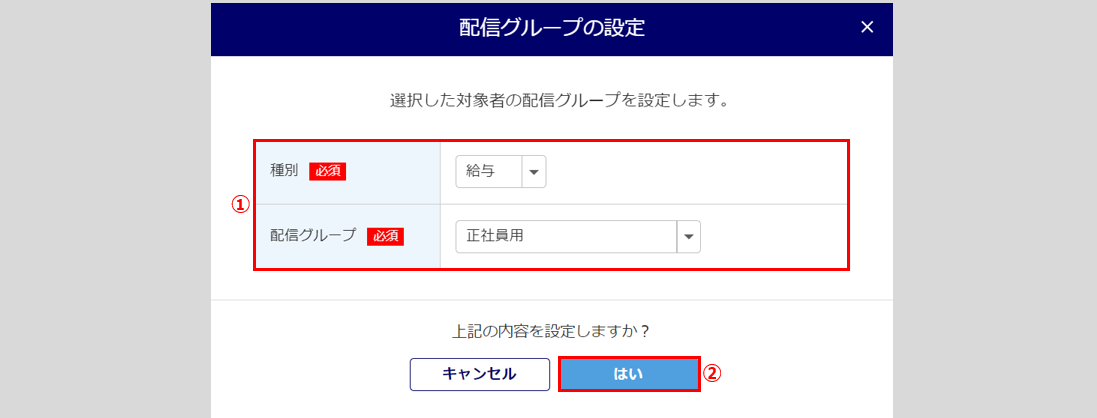 「種別」「配信グループ」(①)を設定し、[はい](②)をクリックします。