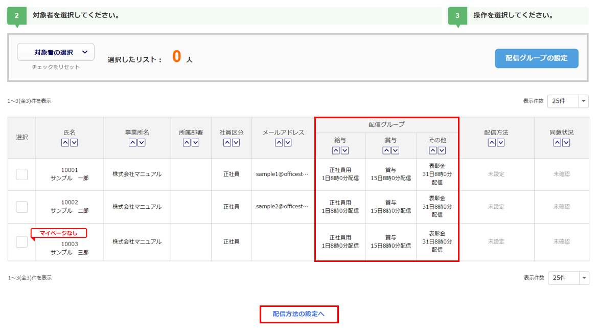 「未」列の数字をクリックすると、画面下部に配信グループが未設定の従業員一覧が表示されます。