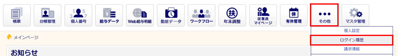 | ログイン日時 | システムまたは従業員マイページにログインした日時です。 |