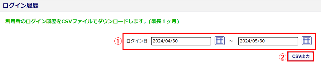 「ログイン日」(①)を設定し、[CSV出力](②)をクリックします。