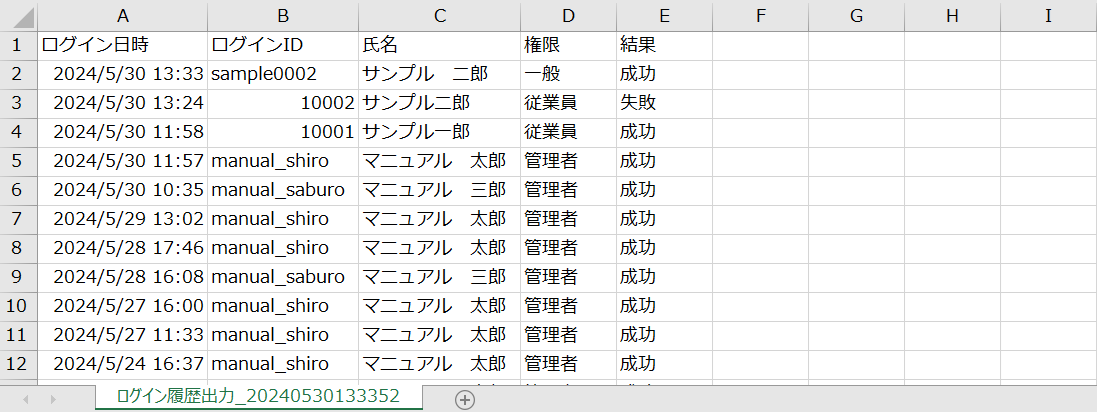 「ログイン履歴出力_yyyymmddhhmmss」のファイル名で出力します。