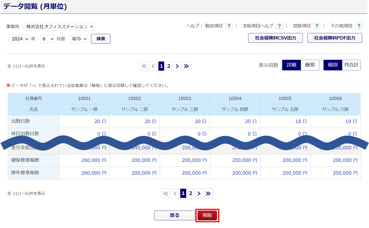 Web給与明細の給与データを削除する方法は、以下の関連記事内「給与データの削除」をご参照ください。