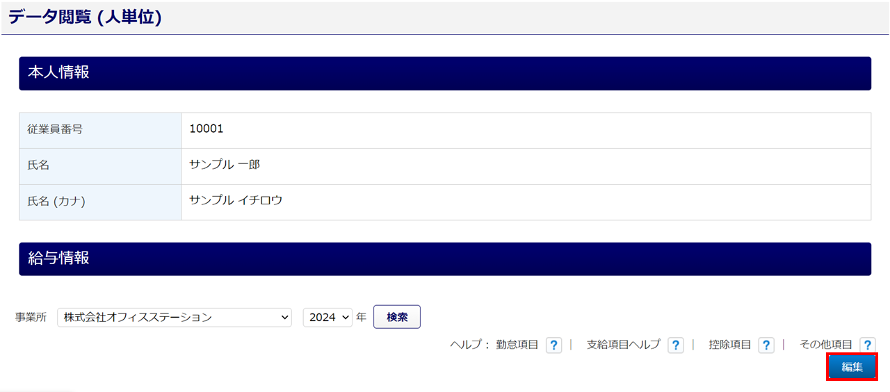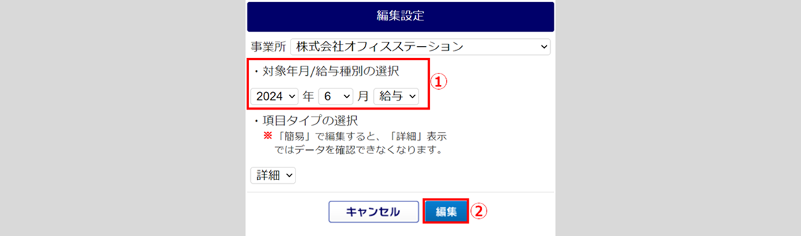 「対象年月/給与種別の選択」()に削除するデータの年月と種別を設定し、[編集]()をクリックします。