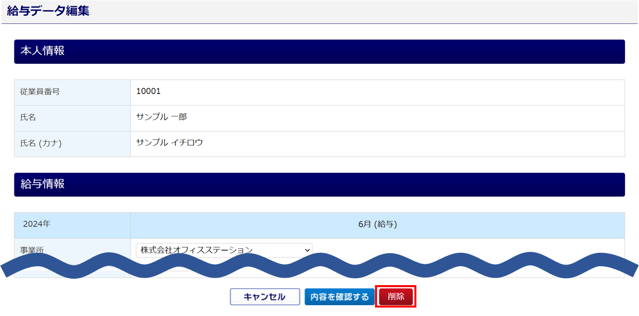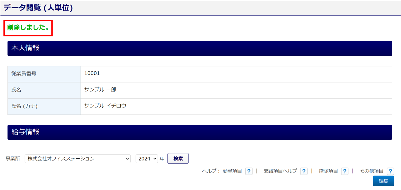 画面上部に「削除しました。」と表示され、給与データの削除は完了です。