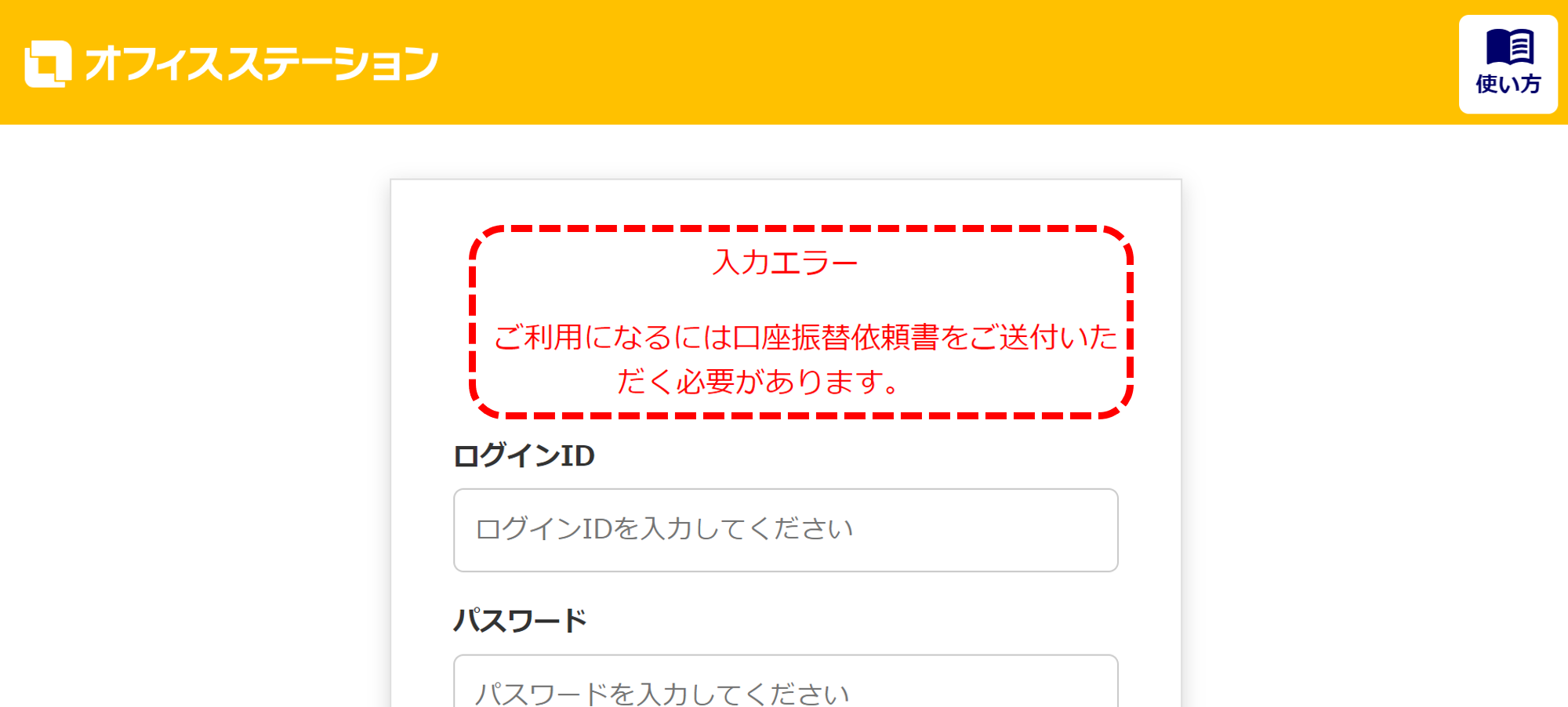ご契約日から2週間以内に弊社へ口座振替依頼書が到着していないと、以下エラーが表示されます。入力エラー : ご利用になるには口座振替依頼書をご送付いただく必要があります。本エラーが表示されている状態では、ログインすることができません。口座振替依頼書を至急、ご郵送ください。