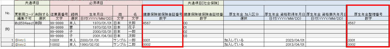 従業員本人用項目[社会保険]内「厚生年金整理番号」に情報を入力、ファイルを保存し、アップロードします。