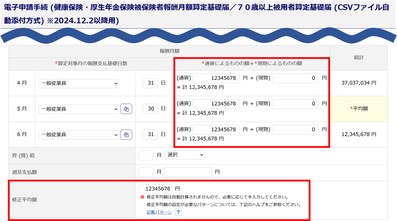 ただし、電子申請される際に、各月の通貨によるものの額、現物によるものの額、計、総計、平均額、修正平均額は、電子申請の仕様上の上限値「9,999,999」に自動的に置き換わって申請されます。
