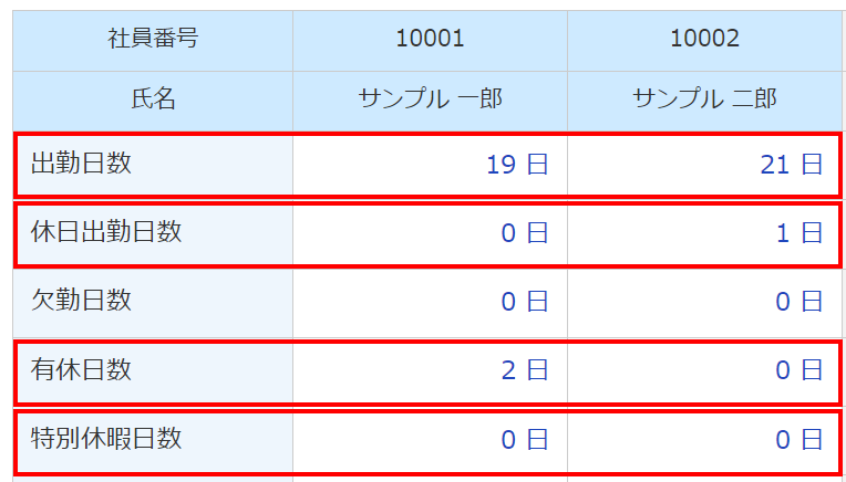 給与データの「出勤日数」「休日出勤日数」「有休日数」「特別休暇日数」を集計した日数を反映します。