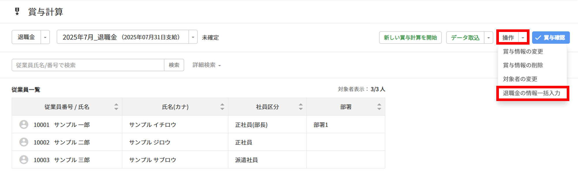 退職金に係る税金を自動計算したい場合、[操作]>[退職金の情報一括入力]をクリックします。