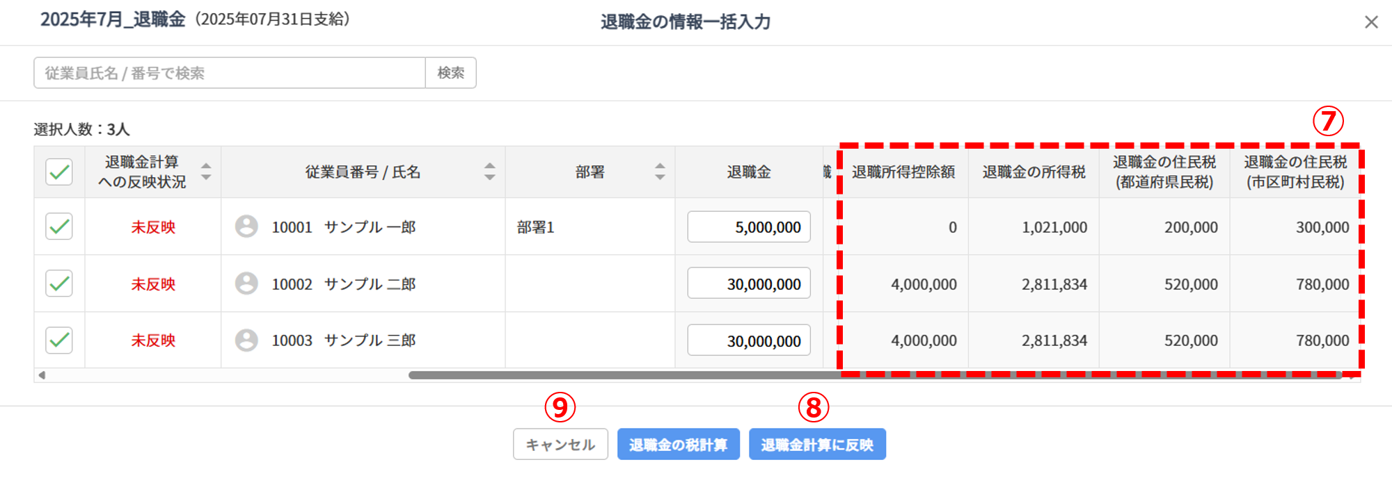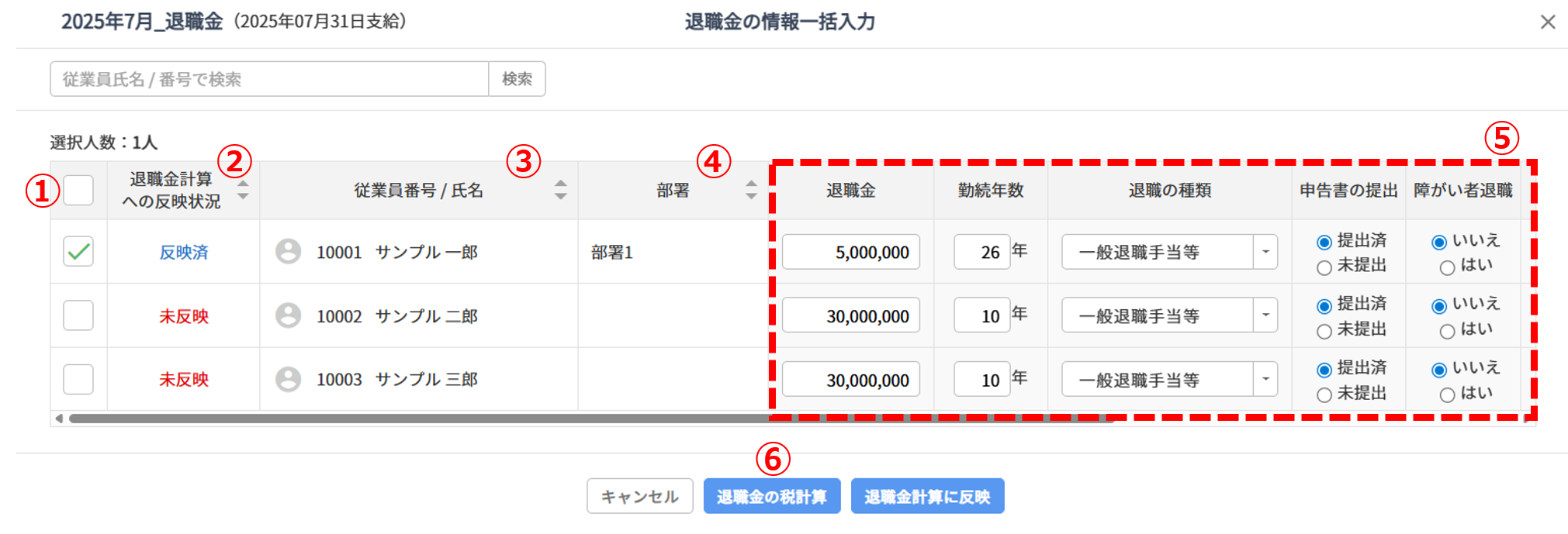 | ① | 選択 | 退職金の計算または反映対象を選択します。 |