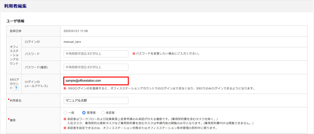 | オフィスステーションアカウント | ログインID | ログイン時に利用するIDを入力します。 4文字以上50文字以下の半角英数字で入力してください。 ※「ログインID」は登録後、変更することはできませんのでご注意ください。 ※利用者管理に登録する「ログインID」が、該当利用者の従業員用マイページ の「ログインID」と重複する場合は、使用できません。 例) 利用者ID:10001(従業員番号を使用) マイページID:10001 (従業員番号を使用) |