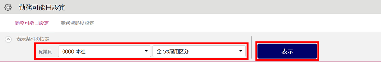1.ホーム画面「設定」内[スケジュール]>[シフト自動作成関連設定]をクリックし、[勤務可能日設定]タブ を開きます。対象となる所属を選択して[表示]をクリックします。