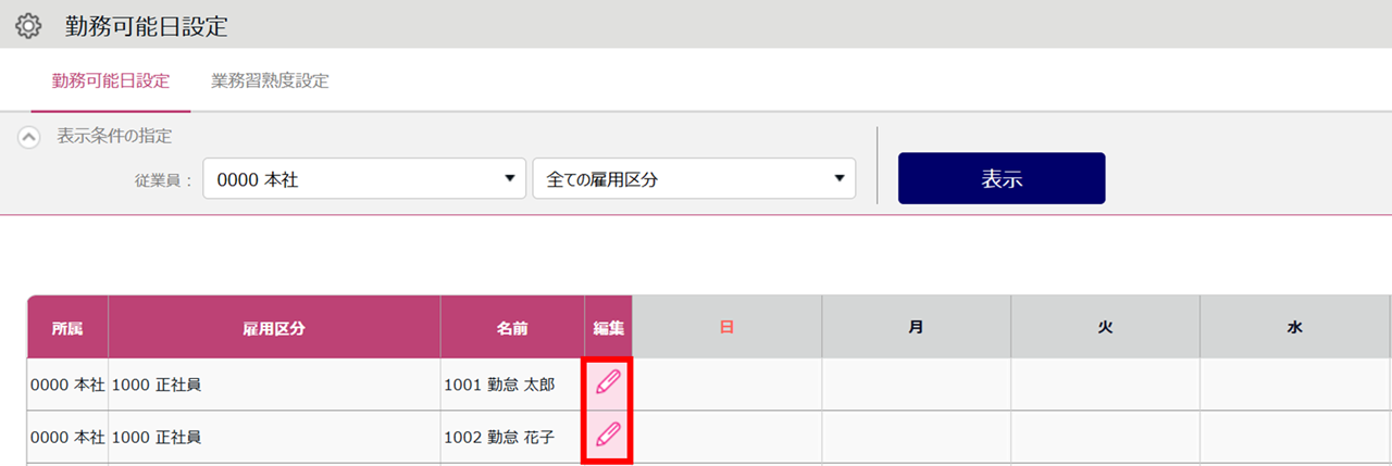 1380|【勤怠】「シフト自動作成関連設定」の設定方法(勤務可能日設定 / 業務習熟度設定)