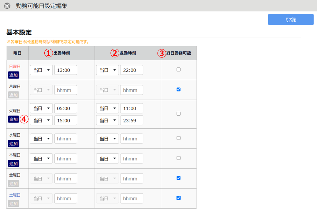 3.各曜日の勤務可能な時間帯を設定します。