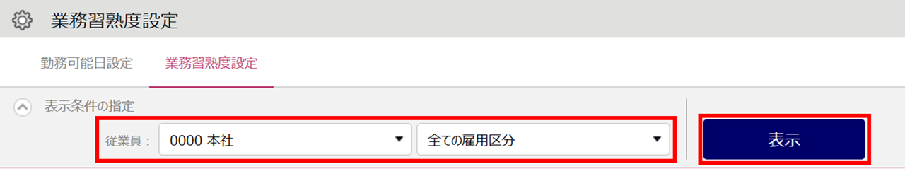 1.ホーム画面「設定」内[スケジュール]>[シフト自動作成関連設定]をクリックし、[業務習熟度設定]タブ を開きます。対象となる所属を選択して[表示]をクリックします。
