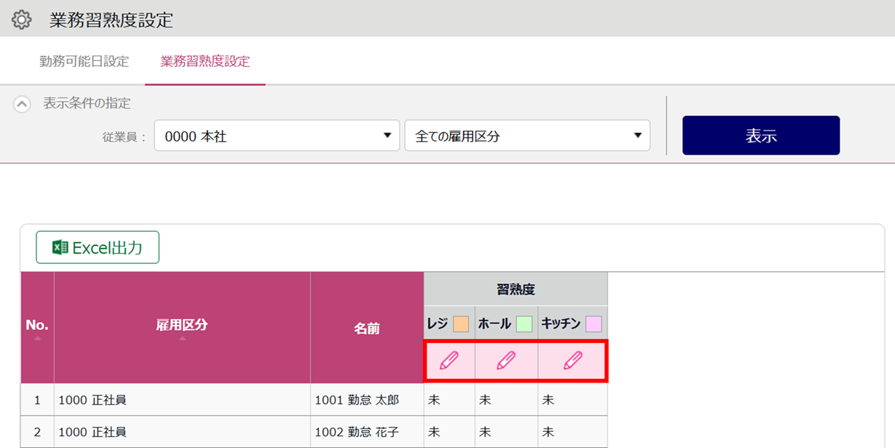 従業員ごとに各業務の習熟度を登録します。シフト自動作成機能を使用する場合は必須の設定です。