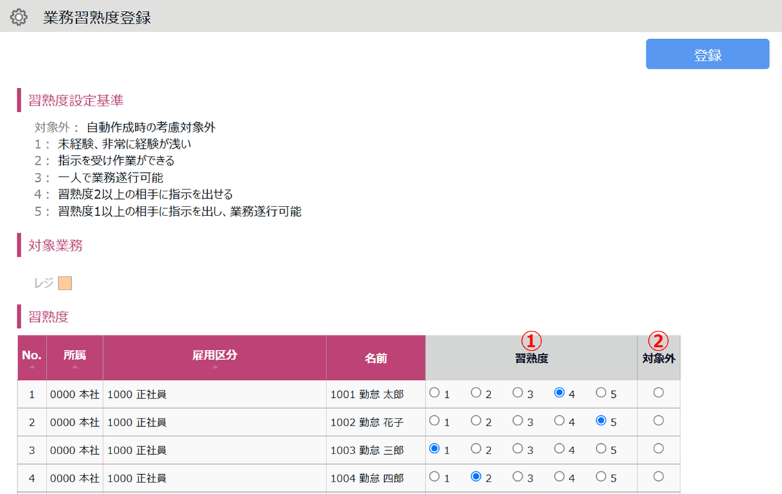 3.各従業員の、対象業務に対する習熟度を設定し、[登録]をクリックします。