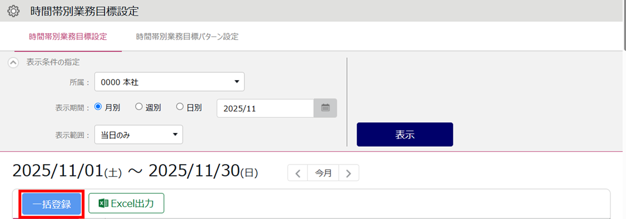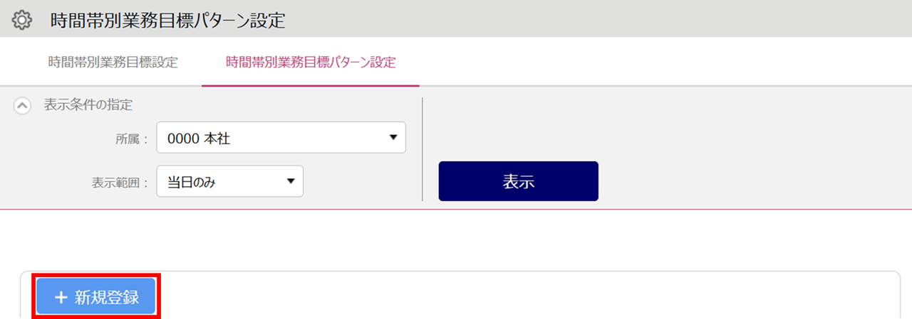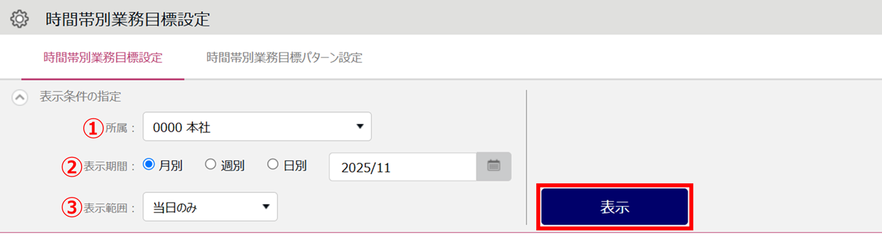 ホーム画面「設定」内[その他]>[目標設定]>[時間帯業務目標設定]タブを開きます。表示条件を指定して[表示]をクリックします。