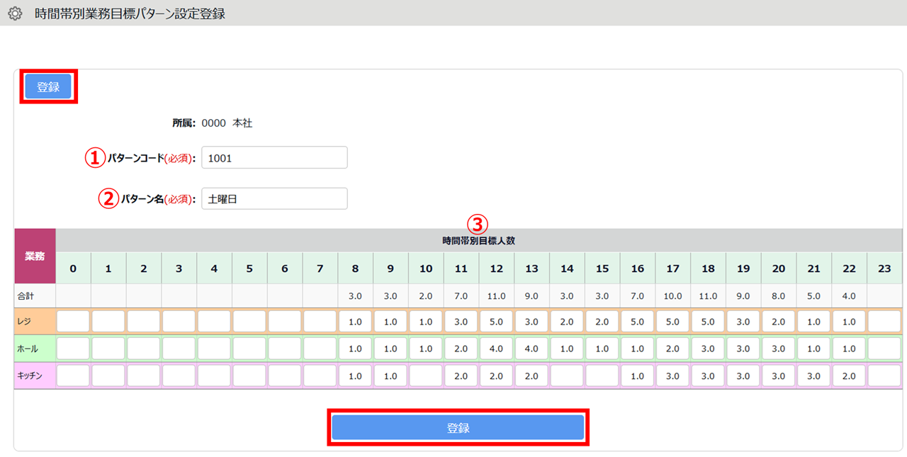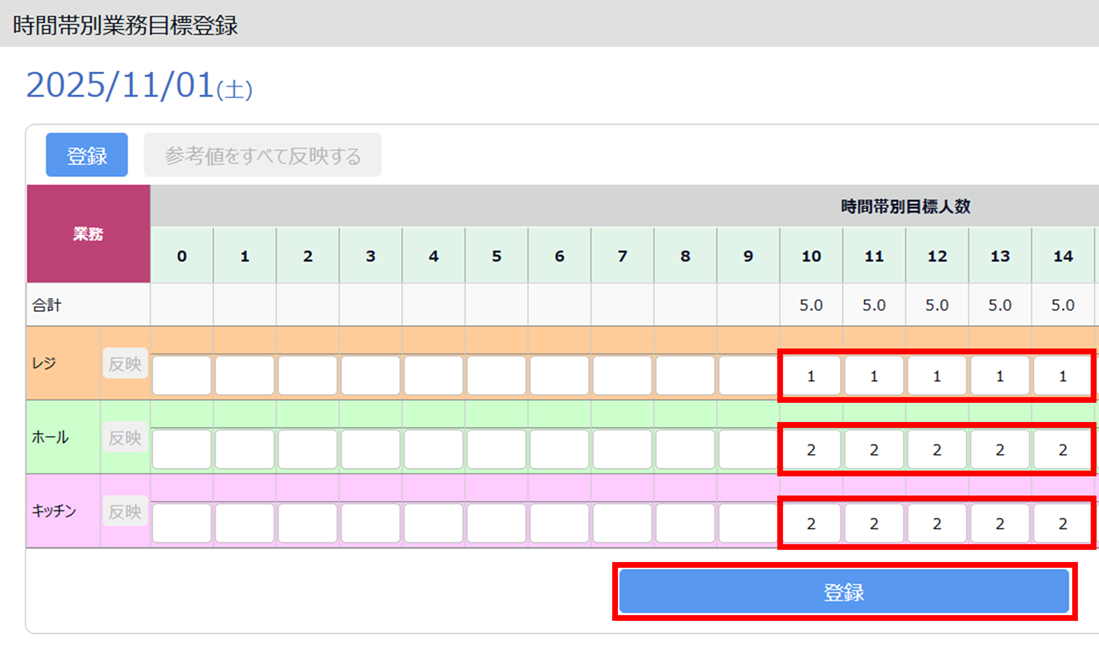 2.各業務の時間帯欄に目標人数を登録し、[登録]をクリックします。