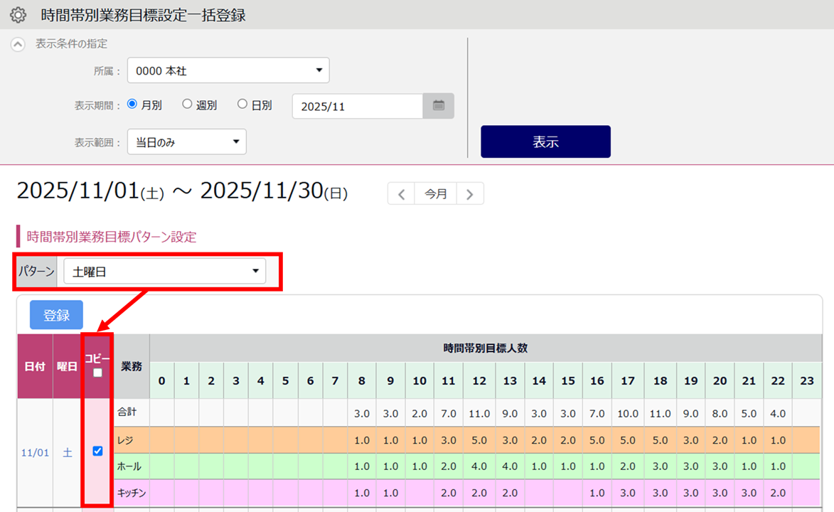 【手順1】で作成したパターンを、該当日に一括で割り当てる方法です。