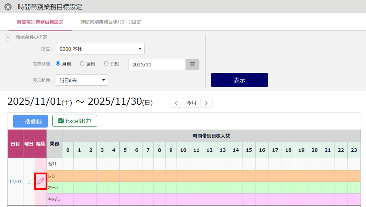 1.対象日の[編集(鉛筆マーク)]をクリックします。