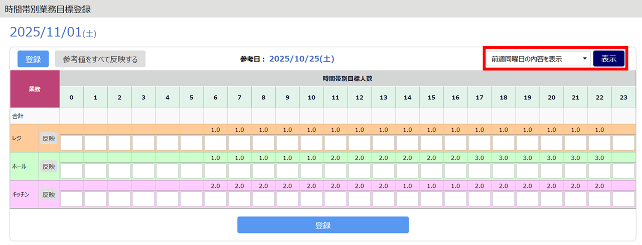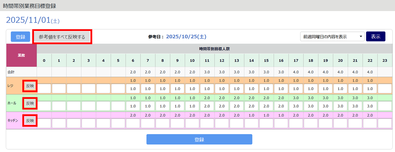 3.[参考値をすべて反映する]または各業務の[反映]をクリックします。呼び出した過去日の目標人数設定が、入力欄に反映されます。