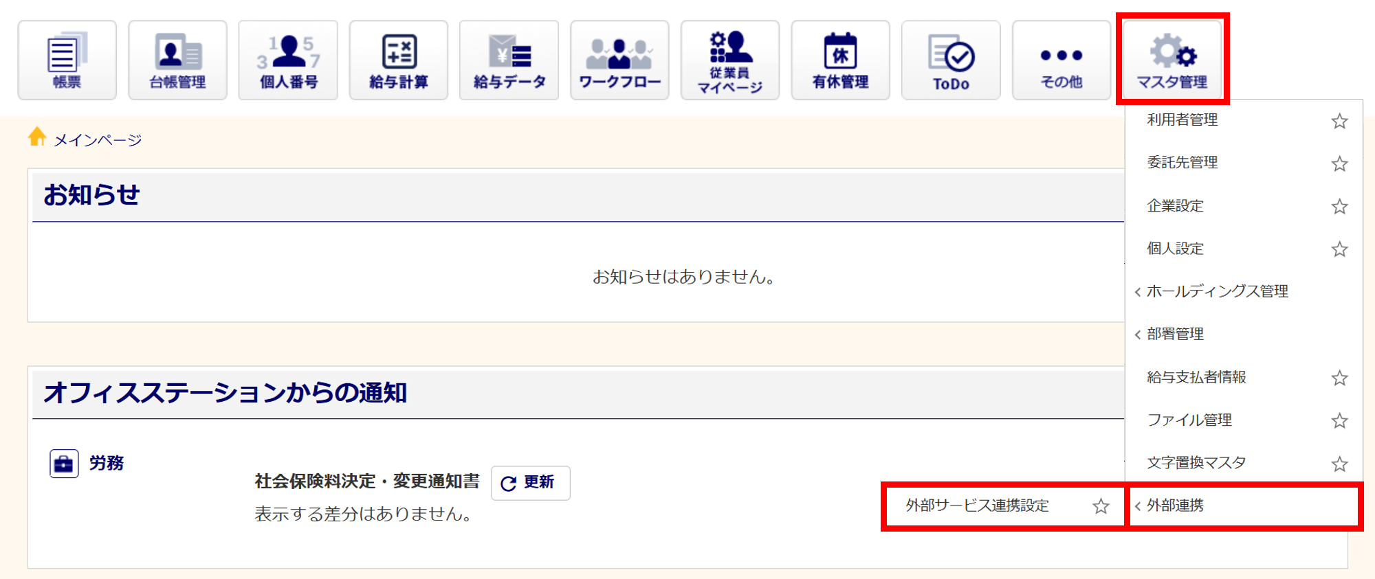 [マスタ管理]>[外部連携]>[外部サービス連携設定]をクリックします。