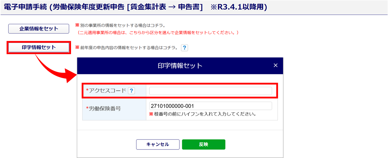 「アクセスコード」を入力することで、「前年度の申告内容」や「申告済概算保険料額」情報を引用することができますので、是非ご活用ください。