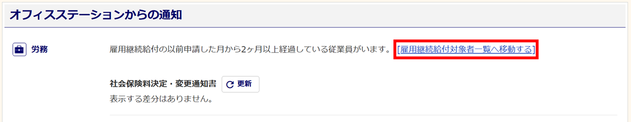 「雇用継続給付」アラート『オフィスステーションから通知される「雇用継続給付の以前申請した月から2ヶ月以上経過している従業員がいます。』については、前回申請をおこなってから2ヶ月経過した際に表示されます。※2ヶ月というのは「月」のみを確認しており、申請をおこなった月から2ヶ月後の「1日」に通知されます。 例)4月25日に電子申請をおこなった場合、『6月1日』に通知されます。