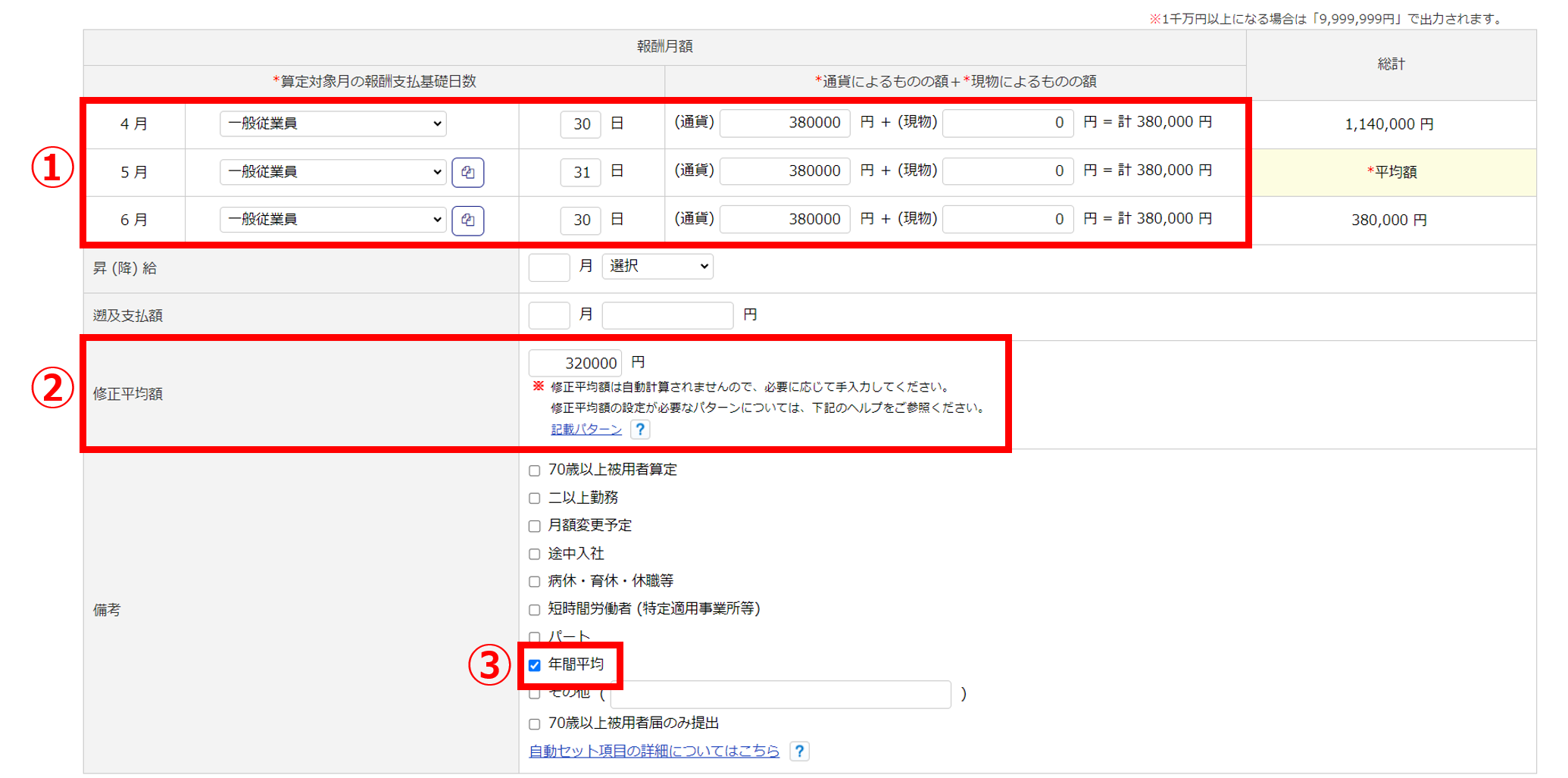 | ② | 修正平均額 | 前年の7月から当年の6月までの年間平均額を入力します。 |
