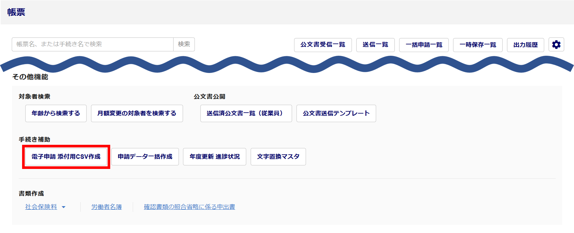 [電子申請 添付用CSV作成]をクリックします。