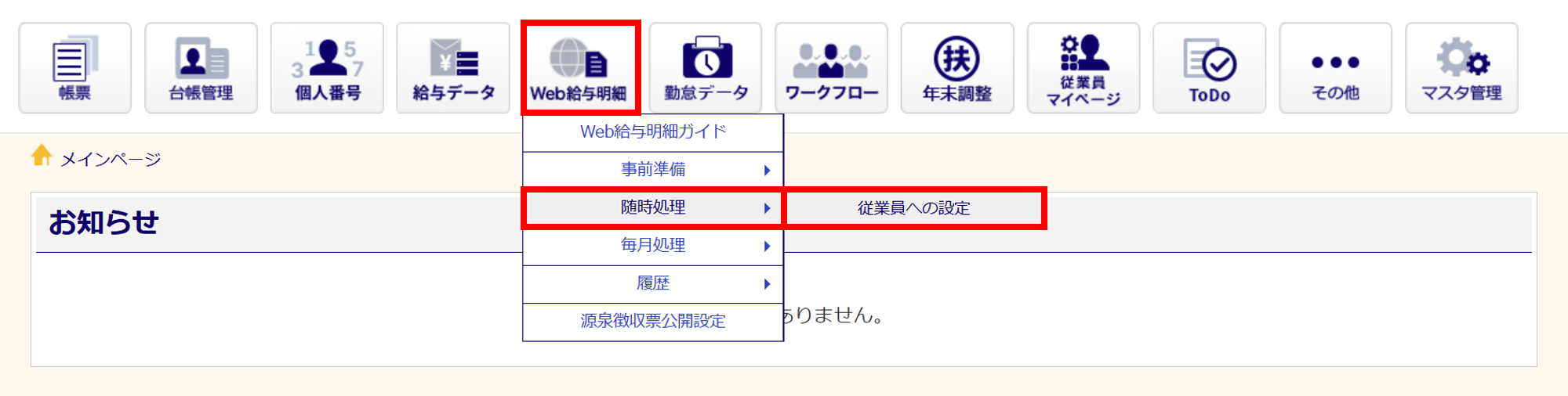 [Web給与明細]>[随時処理]>[従業員への設定]をクリックします。