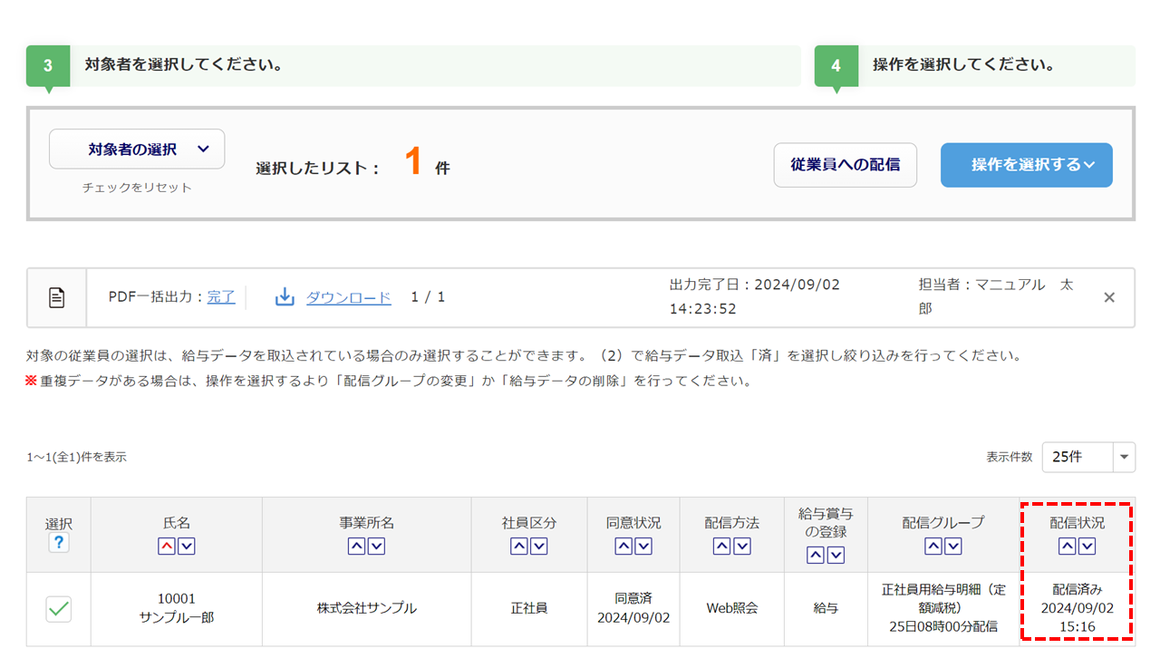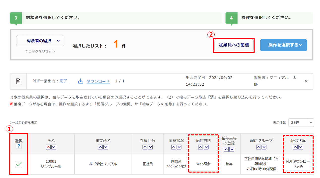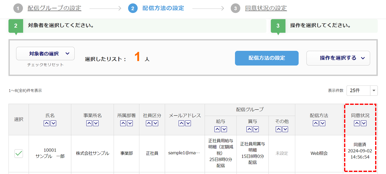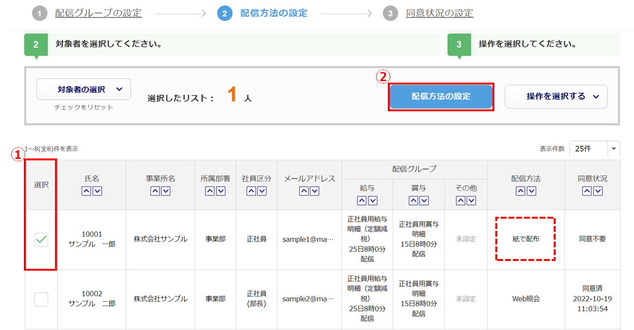 「配信方法」を変更する従業員の「選択」列()にチェックし、[配信方法の設定]()をクリックします。