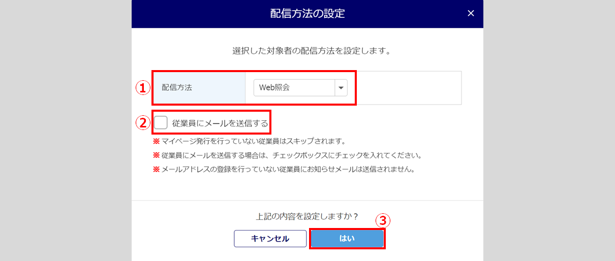 「配信方法」に「Web照会」()を選択し、「電子交付配信方法設定のお知らせ」メールを従業員に送信する場合は、「従業員にメールを送信する」()にチェック後、[はい]()をクリックします。